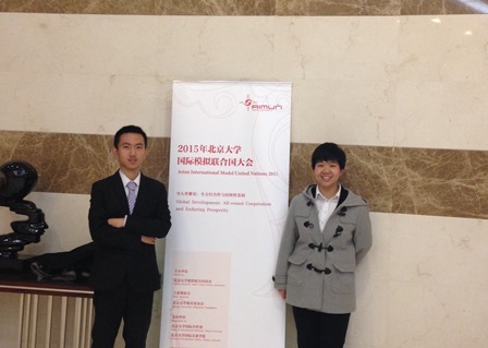 在4月份的北京大学国际模拟联合国大会上,出现了国科大本科生的身影。我校本科生徐月和黄能同学分别作为斐济和加纳的国家外交官员,参与了联合国经社理事会和国际卫生组织的会议,与来自全球各地的年轻人一起,探讨国际大事,提出自己的解决方案。