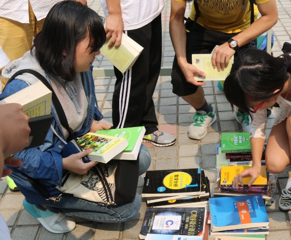 温暖的阳光铺满初秋的校园,中午十一点半,师兄师姐已经做好准备,开始微笑着迎接被吸引而来的同学们。不一会儿,不大的位置前就里三层外三层围满了人。书本种类丰富,保存良好,干净整洁。既有同学必需的课本和练习册,也有陶冶情操的文艺类书籍。同学们认真地翻看着一本本书,向在场的学长学姐发问,每人都得到了耐心而详尽的解答。不少学长更是主动指点,帮助同学挑选最适合自己的书本。