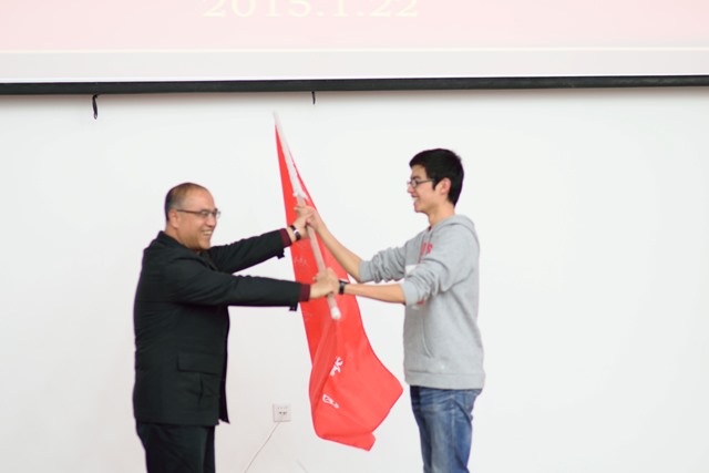 在张宏老师介绍完相关情况后,中科院西安分院党组副书记孙传东为参加实践的学生代表授旗,本次寒假社会实践正式启动。仪式结束后,各招生组老师又分别与各省市的同学们进行了座谈。(文/刘翼豪 图/蒋翔宇)