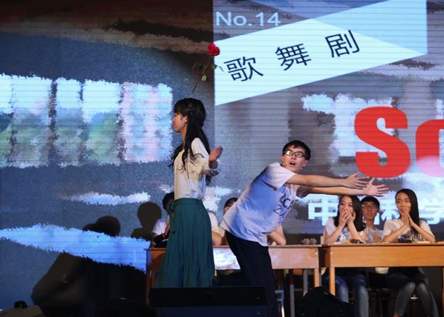 这部歌舞剧——Hot School——是由11位本科生参与,康露老师倾力指导完成。同学们自导自演,歌曲为同学们自己填词,方艺老师为节目编舞并指导。剧情由挂科引出,表现了同学们对于现在及未来的忧虑,而后峰回路转,抛下抱怨,逆风而上,两种截然不同的旋律和情感表现出了一种矛盾,和一种不服输的干劲。